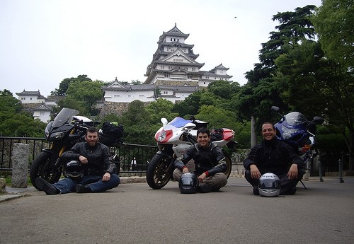 We didn’t get too far as Colin seemed to have debilitated the Agusta. While gassing up he’d left the Zumo and headlight on without the engine running, as he does on his FJR, but now the Agusta wouldn’t even crank over. Time for his 1st lesson in push-starting. Luckily he’s a fast learner, the Agusta trumpeted it’s quad exhausts in a return to life and we were on the road again, headed for Himeji castle.
