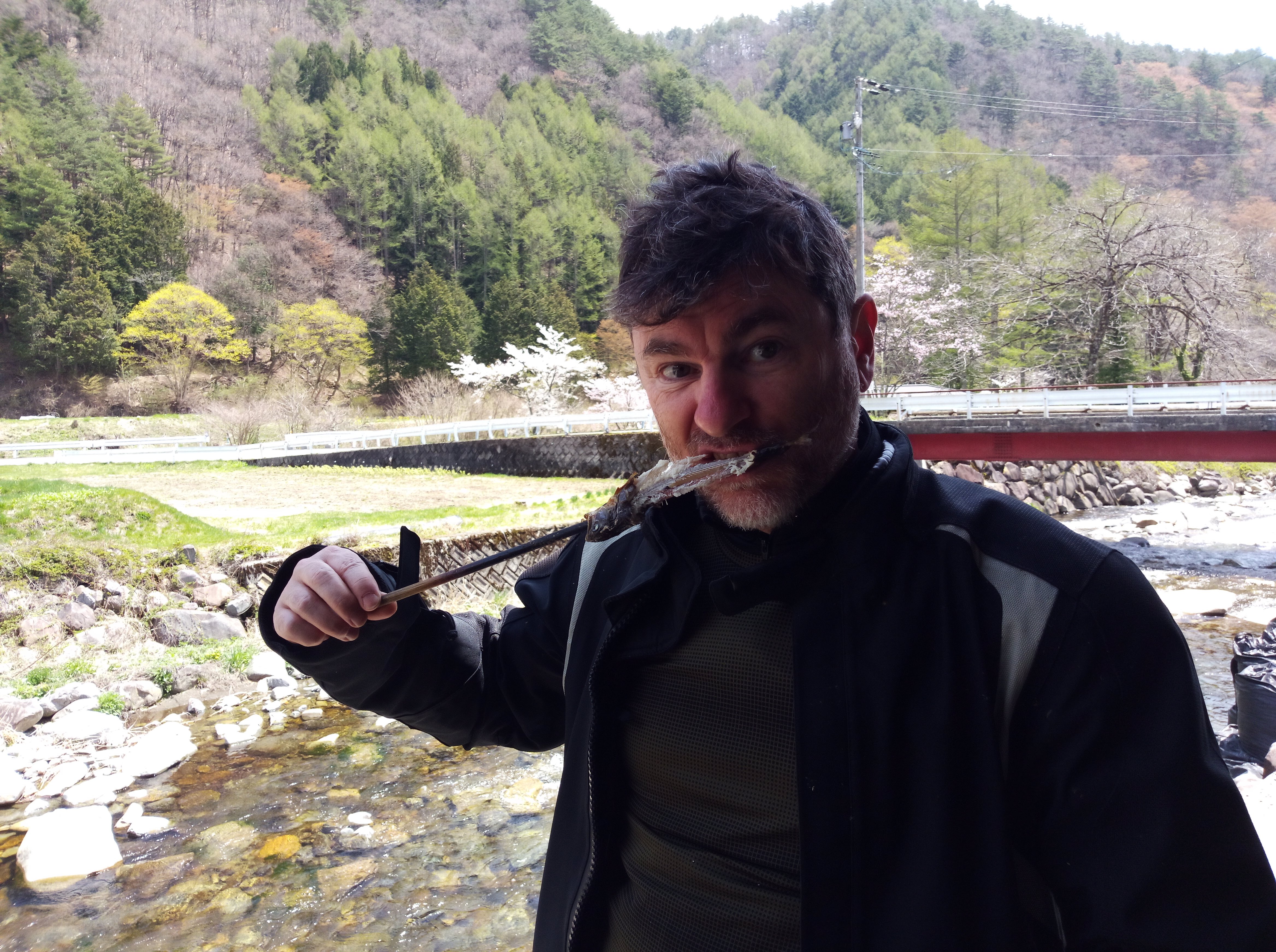Swinging south after Motosu Lake, we rode straight into bumper to bumper traffic leading to a local cherry blossom festival. Those poor cagers, it was like a parking lot for several kilometres in all directions. And sorry gents for riding us straight into it. π