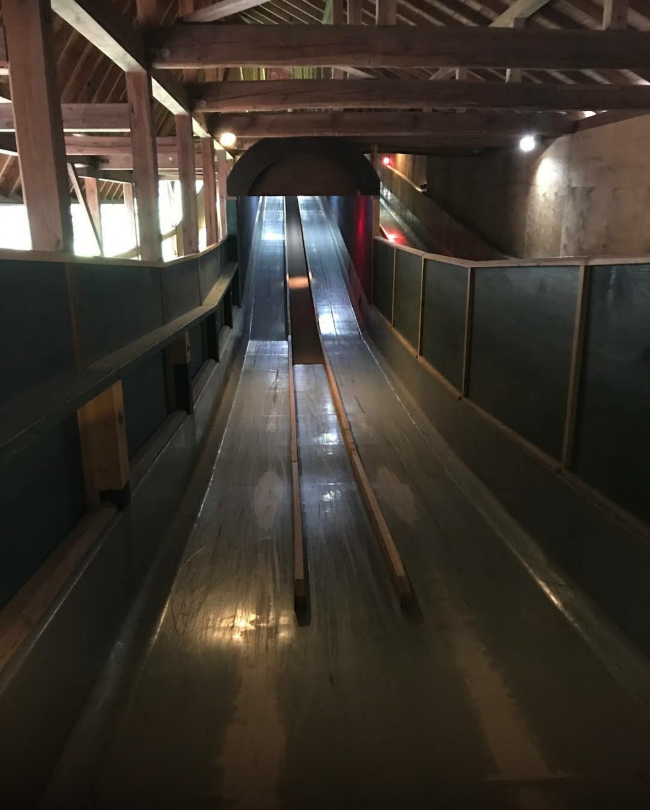 Perfect outfit for the long, fast and deceptively short ended toboggan. I went first and soon after exiting the run came a hurtling fearless mighty John!