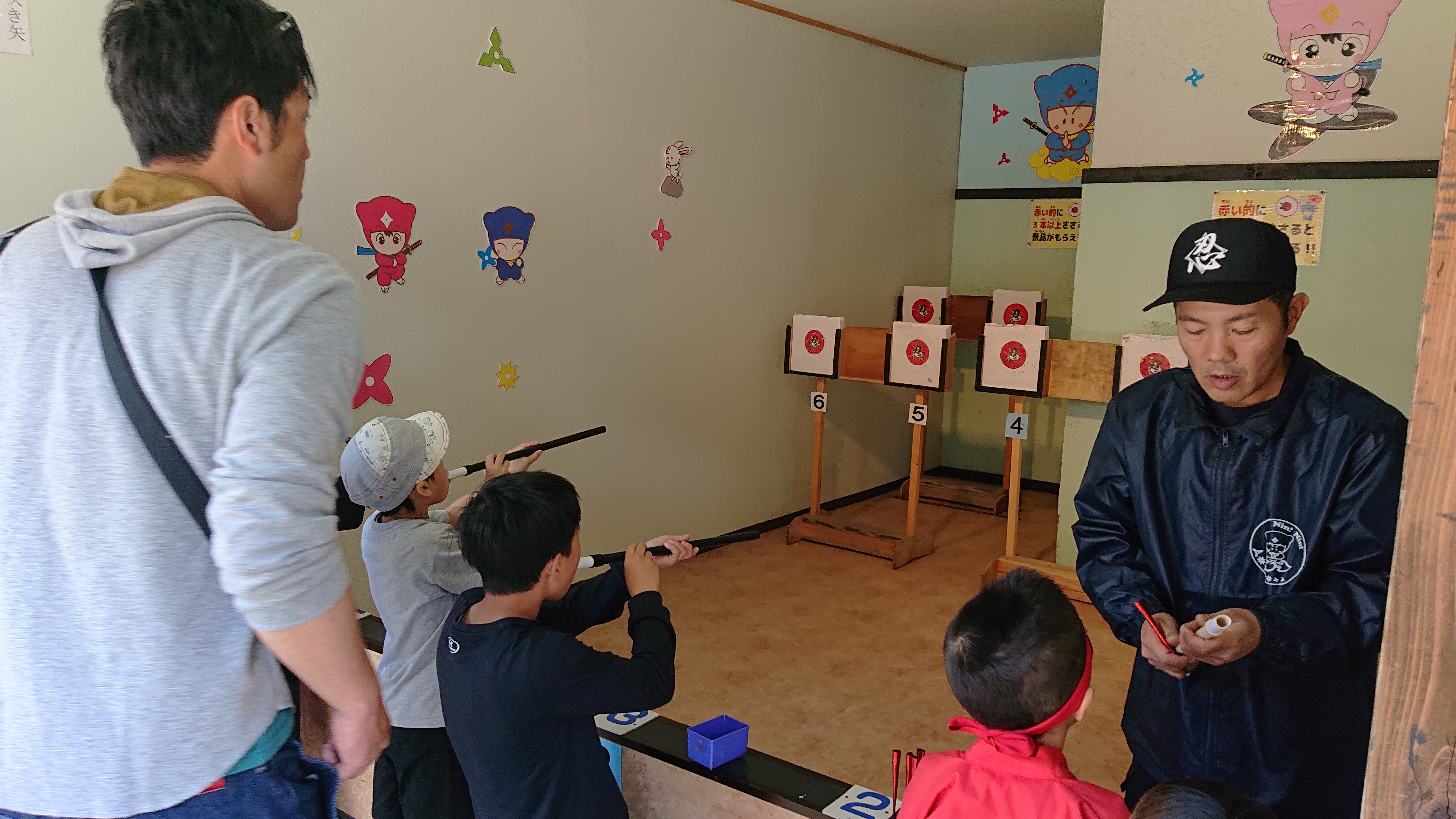 We started out with some blow dart fun. Disappointed with the relatively close and unadventurous big red X on a piece of paper on a stick they had us shooting at, I got us started on trying to hit the logo near the ceiling at the back of the room. Much funner and the lads sent theirs aloft also.