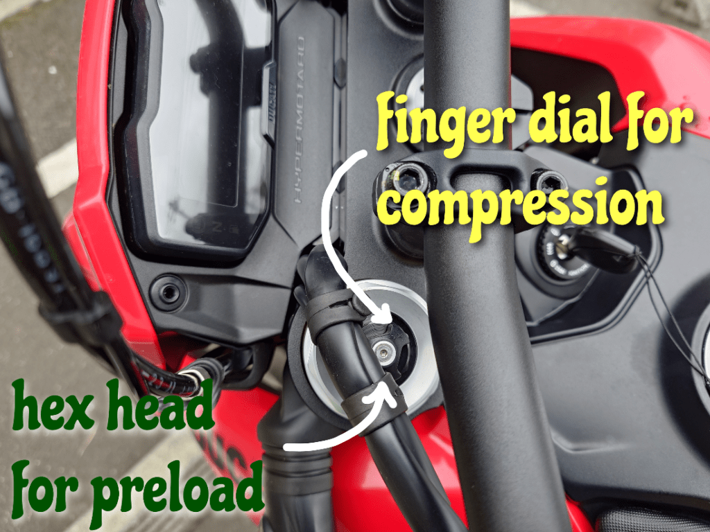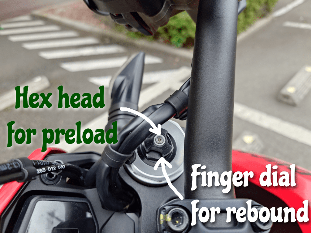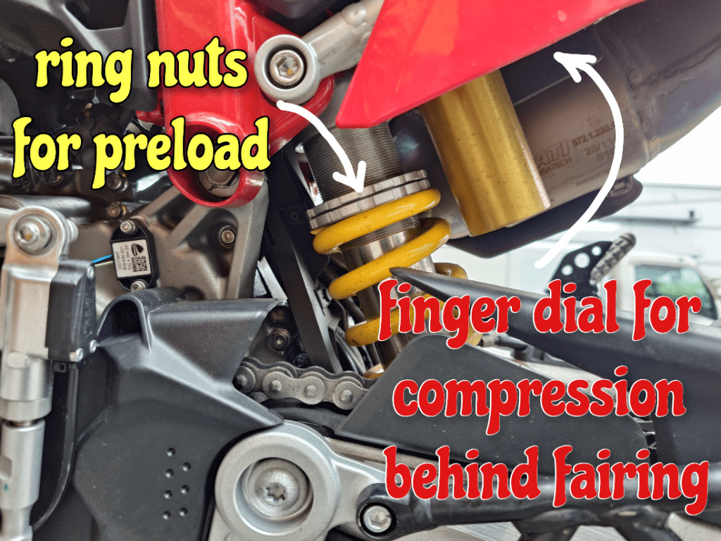 Getting the suspension set up and sitting right isn’t an exercise in finger disfiguring contortionism or needing a toolbox either. Just a tool each for front and rear preload and then it’s all finger fettling of knobs and dials for the fine adjustments.