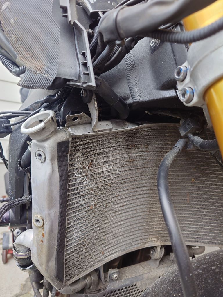 Could’ve been a lot worse. Had my fingers crossed the radiator could be salvaged but that’s not gonna happen. Fortunately, the oil cooler below the radiator is not damaged. Filthy yes, deer rammed no.