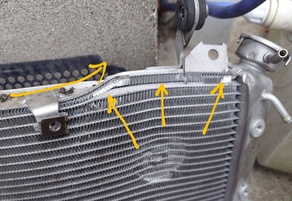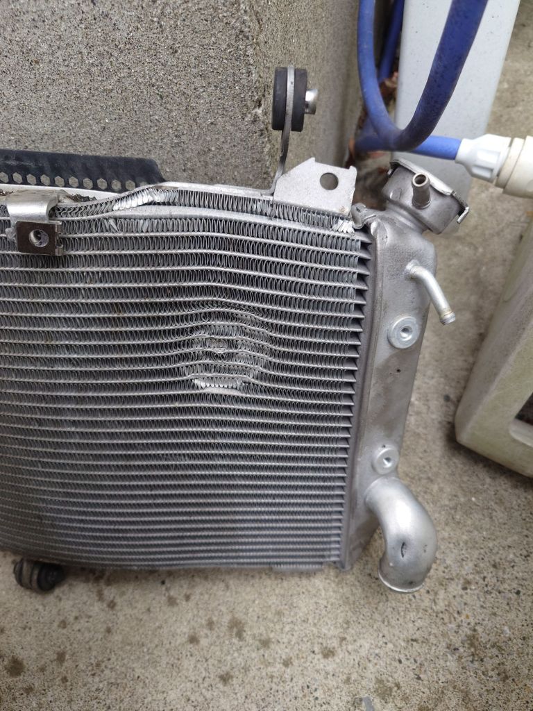 Look how that top row has been peeled forward. The whole right side of the radiator is twisted out of shape with small dents on the exiting pipework.