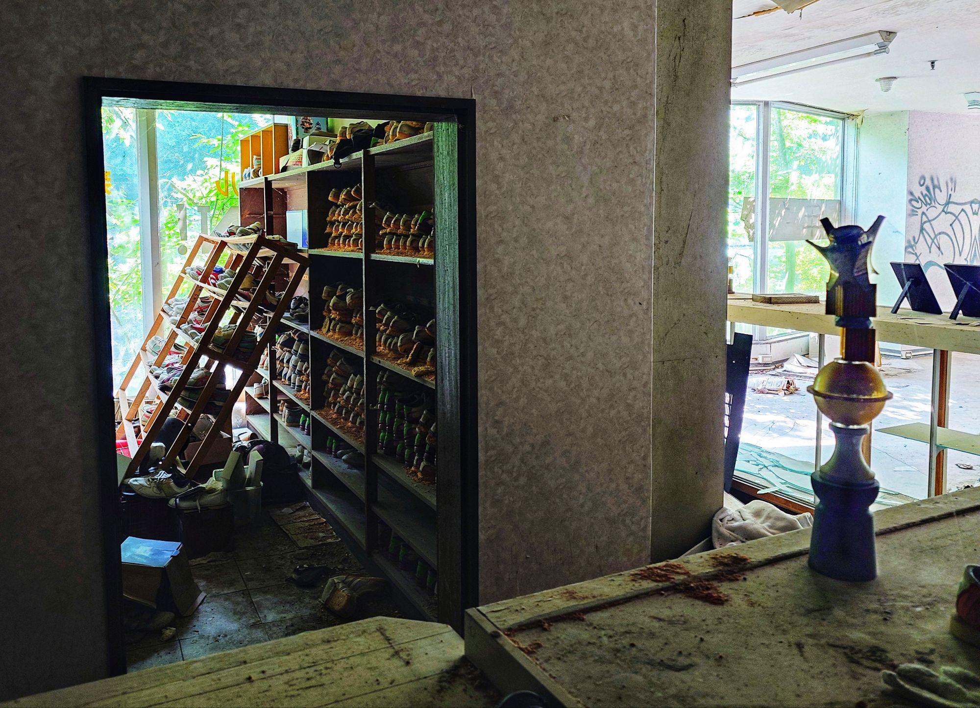 Squillions of bowling shoes still in the racks. Trophies too.