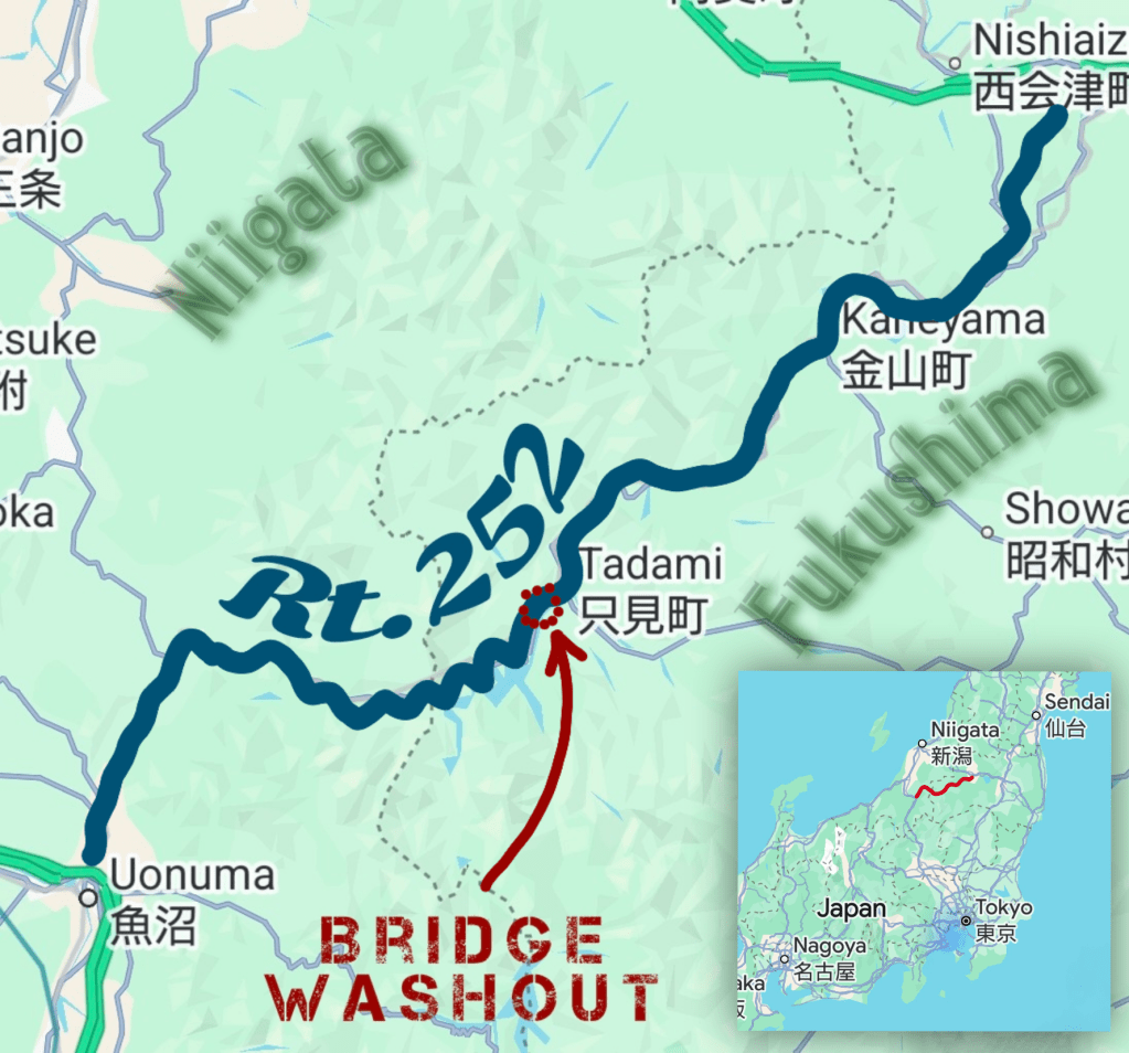 This past winter was exceptionally snowy, and an avalanche in Tadami took out a 54-meter section of a bridge. As a result, the section of 252 from Tadami in Fukushima to the Niigata border remained closed until August 8. The bridge is now open but apparently with alternating single lane access.